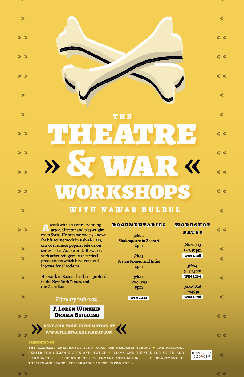 EN / Series of workshops with world-renowned artists Nawar Bulbul and Nandita Dinesh. Organized in collaboration with Bart Pitchford and the PPP Graduate Student Alliance. Produced with generous funding from the Fund for Academic Enhancement of the Graduate School, the Rapoport Center for Human Rights and Justice, the University Co-op, Drama and Theatre for Youth and Communities and Performance as Public Practice.